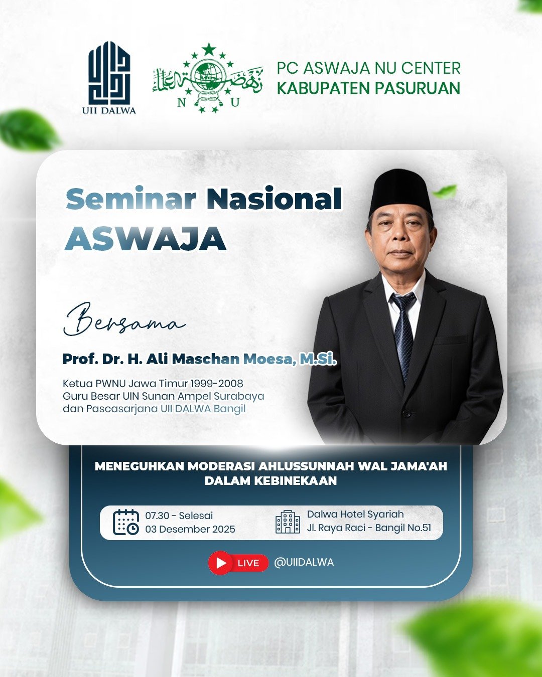 UII DALWA – PC Aswaja NU Center Kabupaten Pasuruan bekerja sama dengan Universitas Islam Internasional (UII) Darullughah Wadda’wah Bangil kembali meneguhkan komitmennya terhadap penguatan wacana moderasi beragama melalui gelaran Seminar Nasional ASWAJA Tahun 2025 bertema Meneguhkan Moderasi Ahlussunnah Wal Jama’ah dalam Kebinekaan. Acara diselenggarakan pada Rabu, 3 Desember 2025 bertempat di Dalwa Hotel Syariah Raci Bangil.